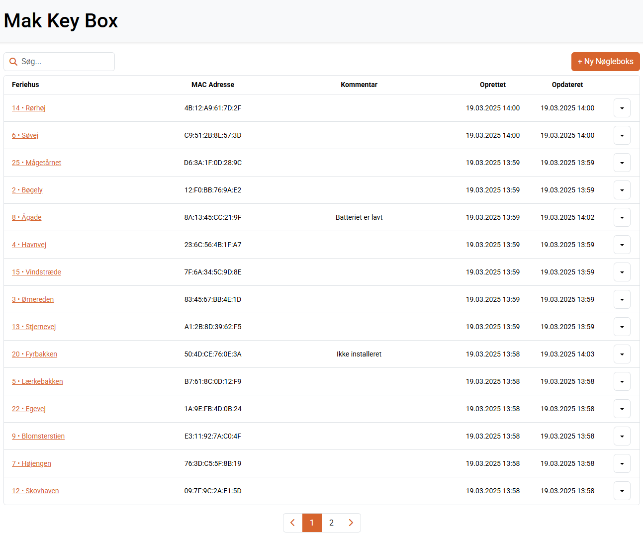 Her har du en liste over huse, hver tilknyttet en MAK-nøgleboks MAC-adresse, og en kommentar.